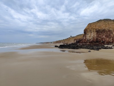 Dia seguinte, pegamos estrada de novo! Fomos descendo pelo litoral, paramos em Costa Dourada. Ali ficamos um pouco, tiramos umas fotos na praia (as falésias são lindas!).