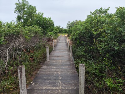 No finalzinho do dia, fomos de carro até a Passarela da Gigica, uma passarela de madeira, bem estruturada sobre um mangue, que chega até uma praia. Aberta ao público, com entrada gratuita e bastante painéis informativos.