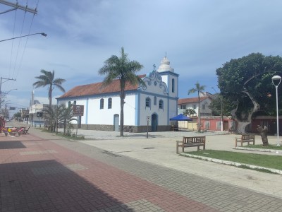 Pela manhã, saímos caminhar pela avenida da praia. Passamos em frente a um hotel abandonado (projetado por Oscar Niemeyer), chegamos à Foz do Rio Guaxindiba. Ficamos ali um pouco, e voltamos para o hotel. Em frente a pousada tem um deck, ficamos ali, entramos na água um pouco.